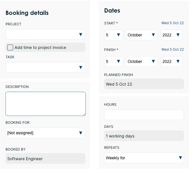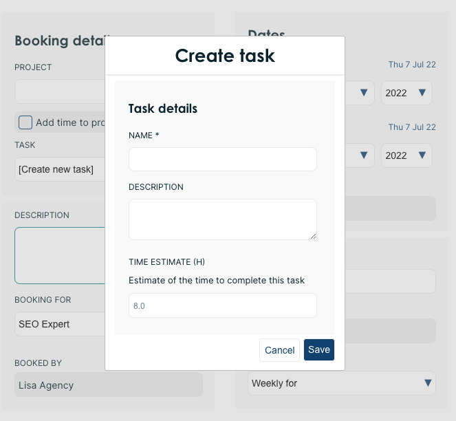 In the calendar, option to create a new task from the booking form. The form has a reduced set of fields, you can still edit them all from the tasks view as usual.
