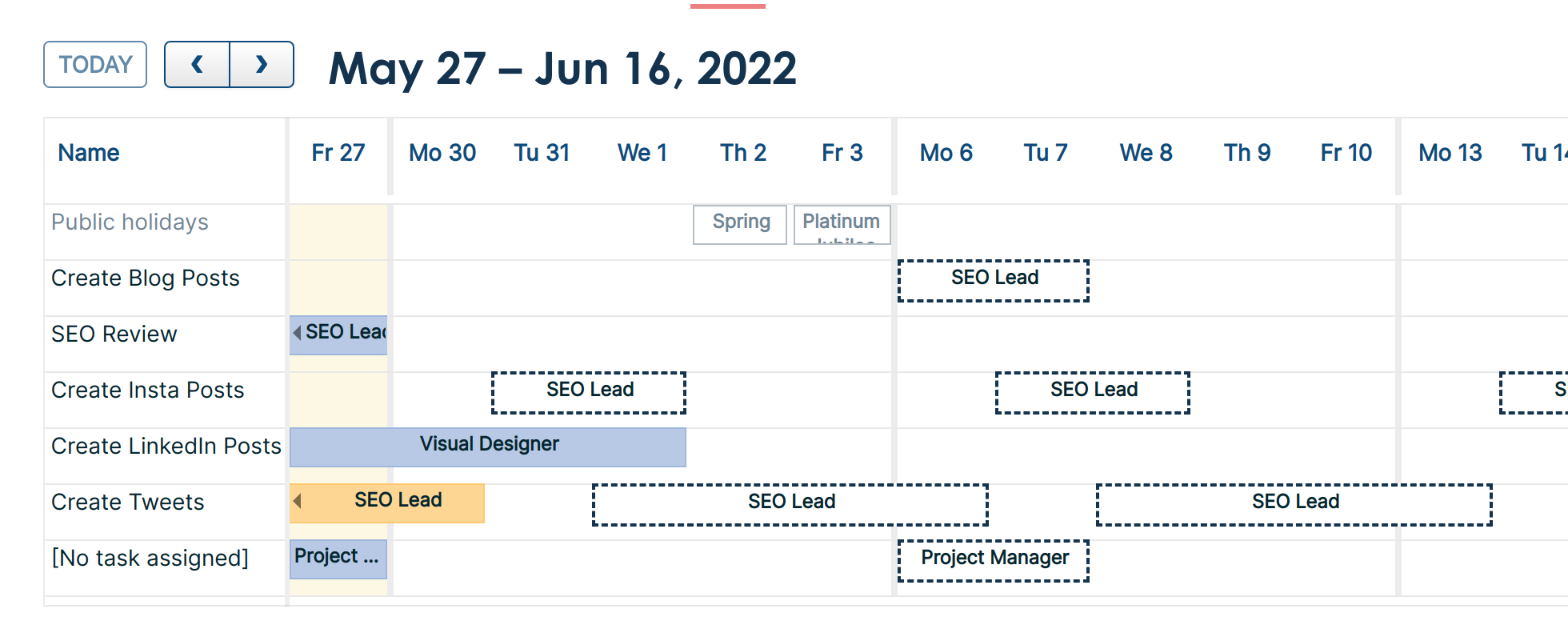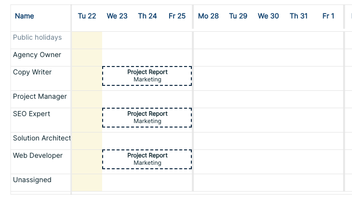 If you make a booking and assign it to a project, but not to a task, it did not show up in the Gantt calendar for the project. We have added a row for bookings with blank tasks. This is useful if you want to book time to the project as overhead, not for a specific task.