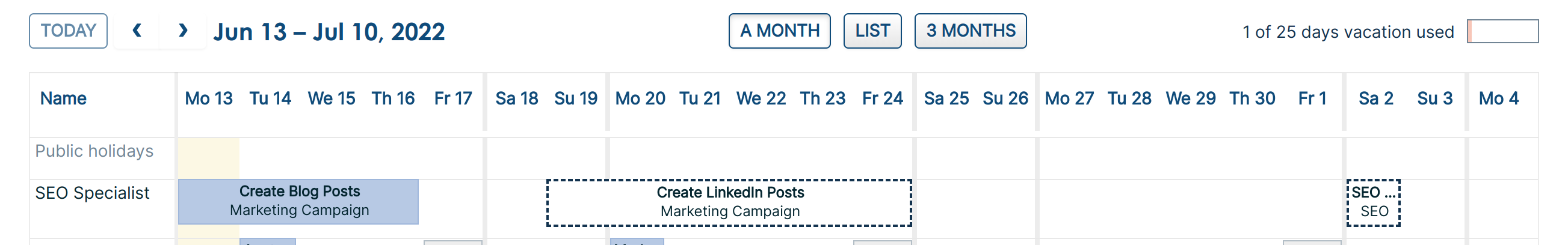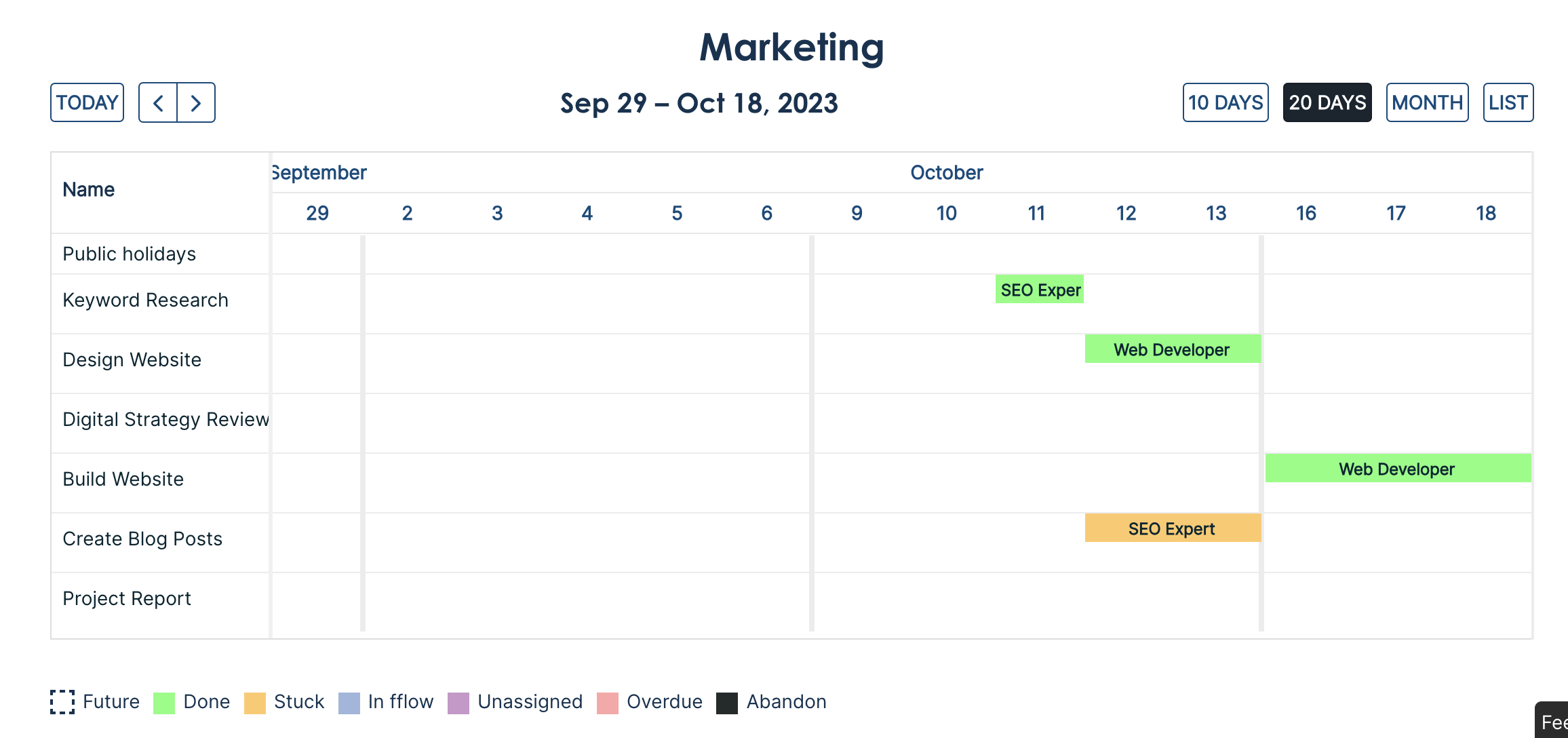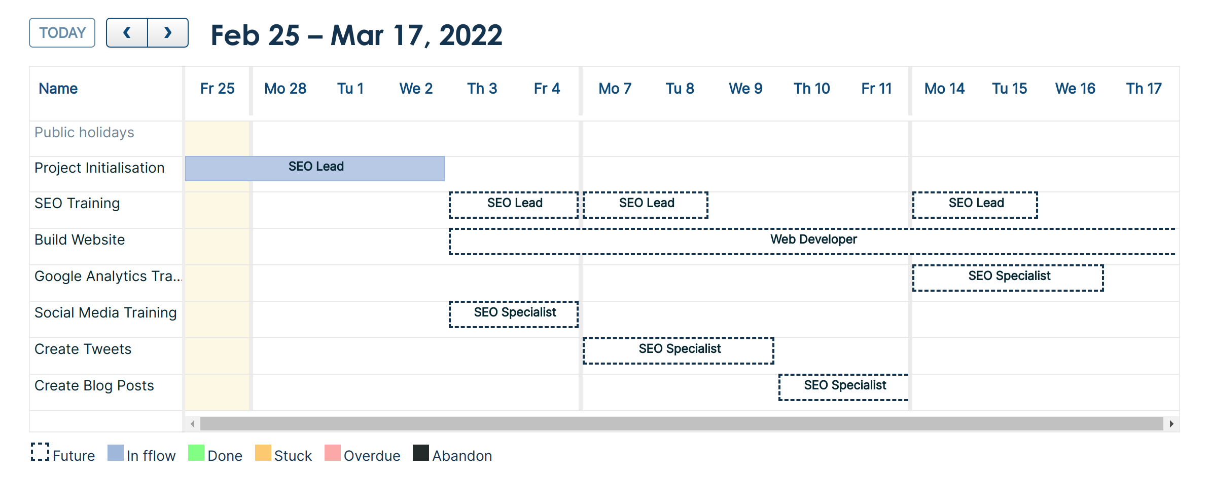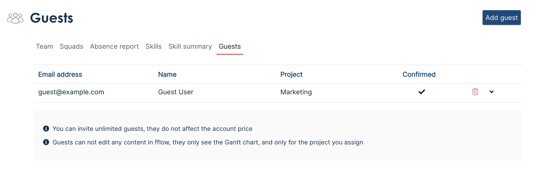 Managers and admins can invite guest users to view a project in fflow. Guest users only have read-only access, and only to the Gantt schedule for the project you assign. They can see bookings and their status, but not time off.