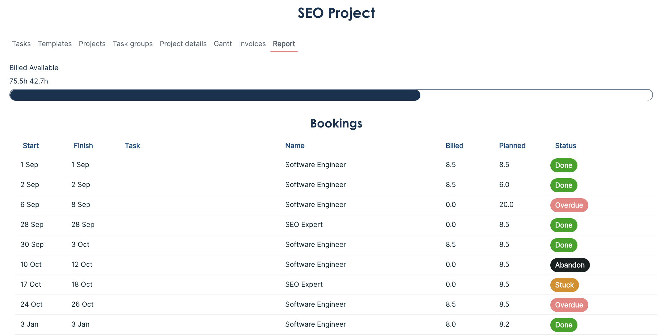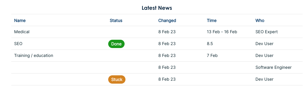 We've been updating the report styling. It now matches the news styling. On the project report page, you only see the bookings for a specific project, whereas in the news section, you see all the bookings you have been working on, from all projects.